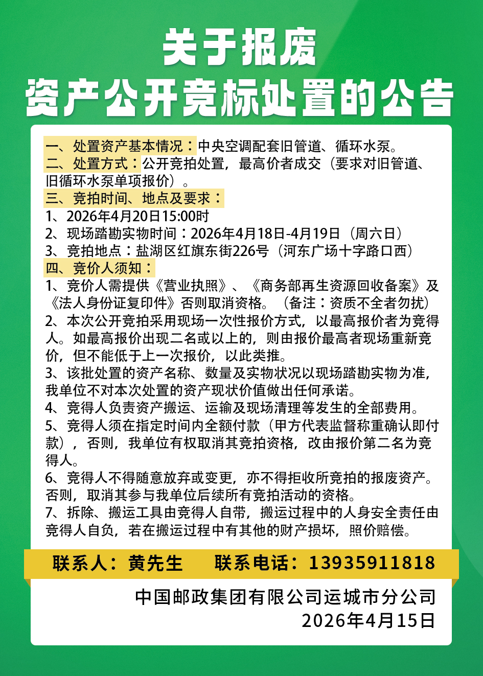 二、处置方式:公开竞拍处置,最高价者成交(要求对旧管道、旧循环水泵单项报价)。