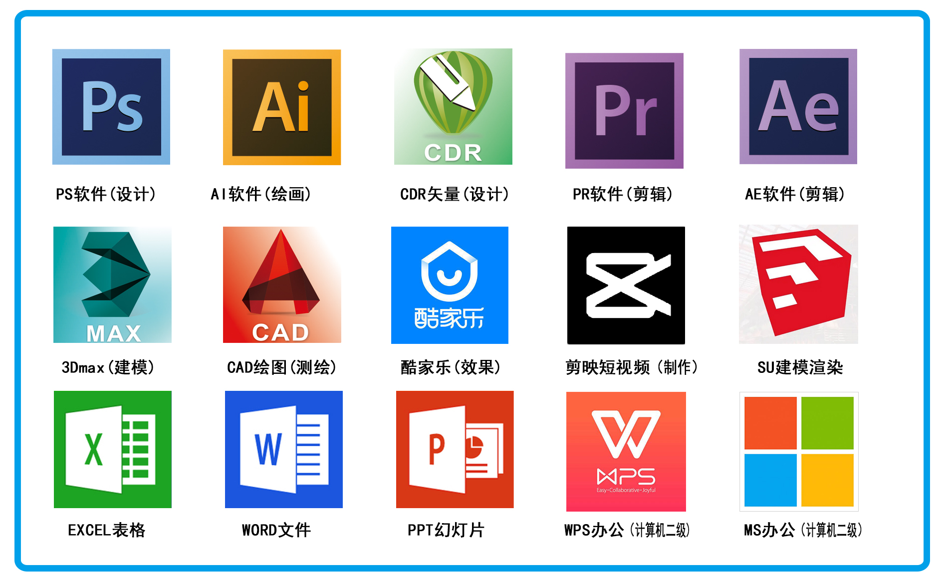 五大课程:视频剪辑 、平面设计、室内设计、办公软件 、 自媒体运营